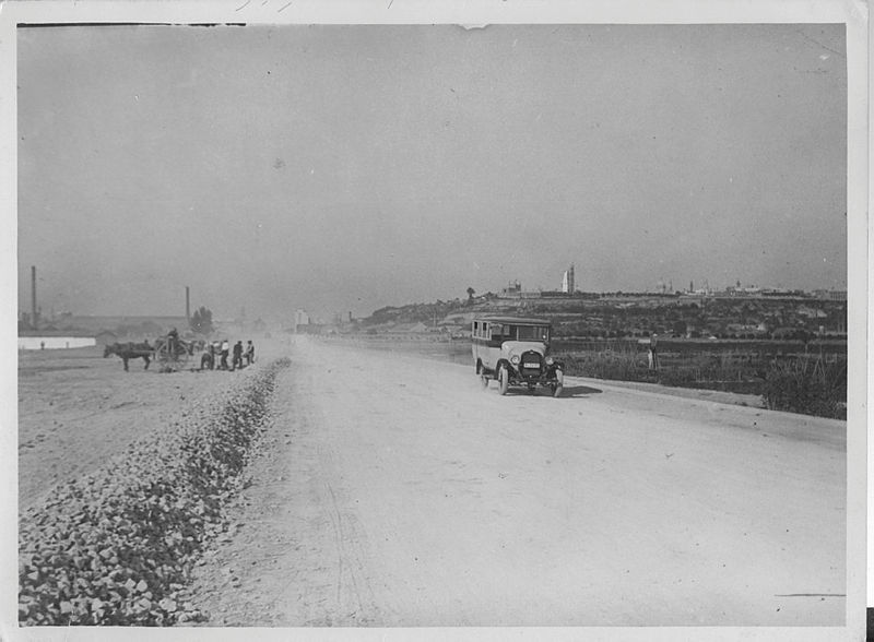 Imatge de la Gran Via en obres entorn els anys 1930.La seva obertura es feu travessant la plana de la Marina, per la seva part alta. A costat i costat es poden veure algunes xemeneixes de fàbriques properes, com, a l'esquerra, l'antiga Caralt y Cia, la propietat de la qual era ja en aquesta època de Delmir de Caralt i Matheu en solitari i que va ser coneguda com a Can Caralt o El cànem. També es pot distingir la fàbrica Viuda e Hijos de Jaime Trias, anomenada després de la guerra civil com a Godó y Trias S.A., que era coneguda popularment com "Les Sangoneres" pel lloc on hi era, el pla de les sangoneres) que quedaria en part també afectada. A la part esquerra de la fotografia hi ha un grup d'homes fent feines del camp carregant material a un carro tirat per un cavall. Per la carretera avança un gran automòbil, que sembla un cotxe de línia. Al fons a la dreta es poden veure les cúpules del Palau Nacional, sobre la muntanya de Montjuïc