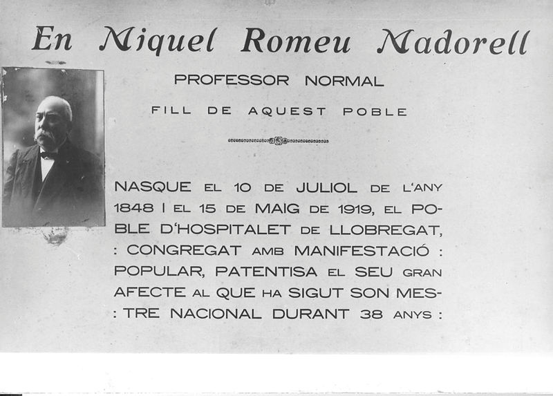 Placa commemorativa, en homenatge al mestre Miquel Romeu i Madorell. A la placa se cita l'any del seu naixement, la data de l'acte d'homenatge i la finalitat del mateix: mostrar l'afecte del poble al que fou mestre nacional durant 38 anys. A la placa també hi ha un retrat de l'homenatjat. Miquel Romeu va néixer el 10/08/1948 i va morir el 2/05/1923