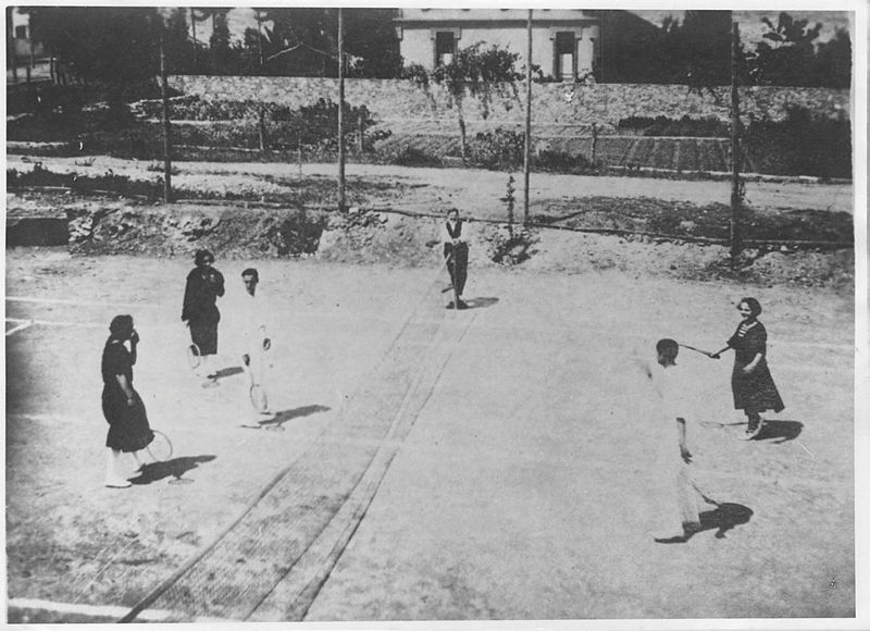 Homes i dones jugant a tennis al solar propietat del mossèn Santiago Oliveras on, el 1926 es va construir el Centre Catòlic. Darrera el camp s'observa el carrer Tarragona i, a l'esquerra, la rambla de Just Oliveras. Al fons, la torre de Felipe de Alverico, la façana principal de la qual, rendia a un jardí que rendia, alhora a la Rambla Just Oliveras. Aquesta torre estava situada a tocar del carrer Tarragona, gairebé davant de la casa modernista de Josep Oliveras, casa aquesta darrera que va ser la primera que va ser construïda per animar els propietaris a traslladar allà la seva residència.
