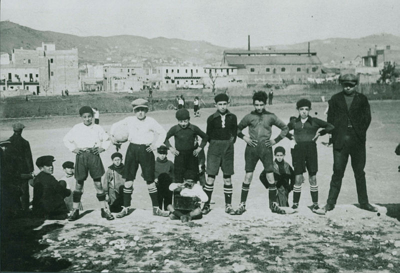 Segons la informació que en consta, són nens de l'equip Torrassenc al camp de futbol abans de la guerra (dècada de 1930). Podria tractar-se del terreny de joc del Club Deportiu Torrassenc situat al triangle format per la Carretera de Collblanc, la Riera Blanca i la Travessera de les Corts. El Deportiu Torrassenc (fundat el 1917) també havia tingut un camp al carrer Aliança (actual c/ Mare de Déu dels Desemparats), entre els carrers Joventut i Llançà. I va tenir breument un segon terreny de joc entre el carrer Badal i Riera Blanca. Posteriorment, a partir de 1931 va jugar els partits al camp de Carretera de Collblanc, que compartia amb la Unió Athlètic Club de Collblanc. Durant la dècada de 1920 el Club Deportiu Torrassenc va guanyar diversos campionats de futbol amateur.