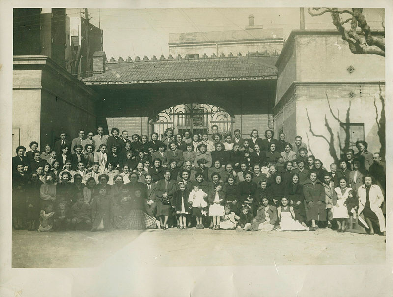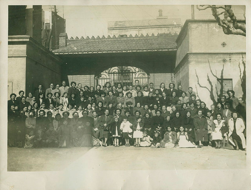 Entrada de la fàbrica Can Rifà. Fotografia de grup dels treballadors i treballadores de la fàbrica a la primera meitad dels anys cinquantes. Es veu la Lluïsa Gimeno Quinquillà a la filera del fons, la que sobresurt a l'esquerra de la reixa i el 6è començant per l'esquerra de la mateixa filera era l'encarregat, sr. Lluís. La fàbrica Jacint Rifà es va posar en marxa l'any 1912.