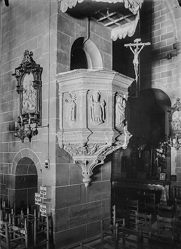 Interior de l'antiga església de Santa Eulàlia de Mèrida. S'observa que a l'església hi havia repartits diversos plafons ceràmics amb diferents escenes de la passió de Crist. També s'observa amb detall el treballat púlpit de pedra des d'on el rector feia l'homilia, on es presenten imatges del papa Marti V ( Papa de 1417- a 1431), Otto di Colonna, que va aconseguir eliminar el Cisma d'Occident i restaurar Roma com a seu del papat, amb la seva creu de tres braços, i al bisbe de Barcelona, que porta a la mà una reproducció de l'ermita de Provençana a la mà, personatges del s. XV coetanis a la construcció de l'església original. Com a parròquia, Santa Eulàlia de Provençana no s'esmenta fins l'any 1045. Sembla que l'any 1076 es documenta la construcció de l'ermita, que es consagra el 27 de gener de l'any 1101 pel bisbe Berenguer Folc. L'església de Santa Eulàlia de Mèrida de l'Hospitalet centre té el seu origen a finals del segle XV, quan el nucli de la Pobla d'Hospitalet té ja una cinquantena de cases i una personalitat diferenciada del nucli més antic de Provençana com per a construir un nou temple parroquial.