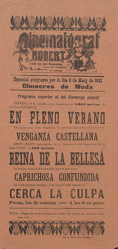 Cartell amb la programació del Cinematògraf Robert (Café de Cal Carreter, al c. Major, 109). La programació inclou: l'estrena de "En pleno verano", "Venganza castellana", "Reina de la bellesa", "Caprichosa confundida", i "Cerca de la cúpula".