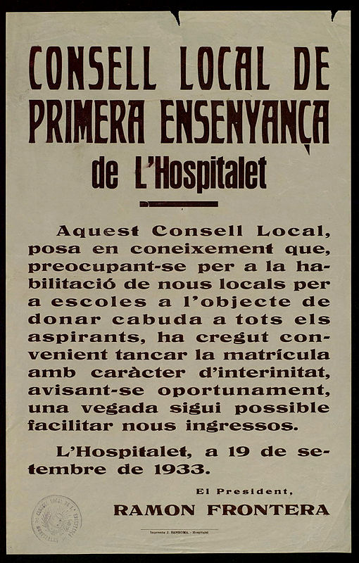 Cartell amb l'avís que el Consell Local de Primera Ensenyança de L'Hospitalet tanca provisionalment el període de matrículació per problemes en l'habilitació d'espais.Signa Ramon Frontera, president del Consell Local. Posteriorment, Ramon Frontera va ser l'Alcalde de la ciutat en l'època republicana (mandats 1934 i 1936).