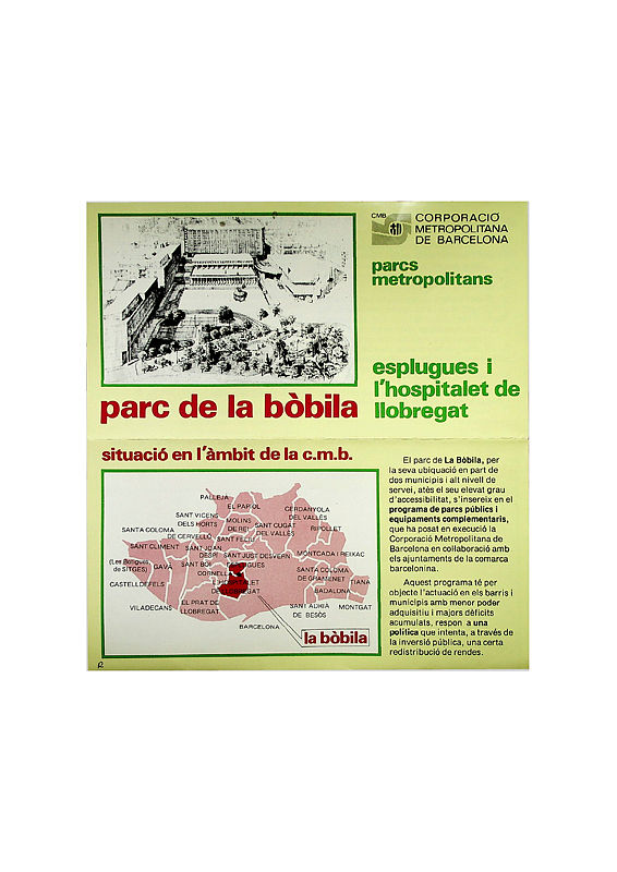 Fulletó informatiu editat per la Corporació Metropolitana de Barcelona que presenta el projecte de construcció del Parc de la Bòbila, que es situarà entre els municipis de l'Hospitalet de Llobregat i Esplugues. Inclou un plànol dels municipis de la Corporació Metropolitana, un altre plànol que mostra la situació del parc i un dibuix detallat de la planta del projecte.