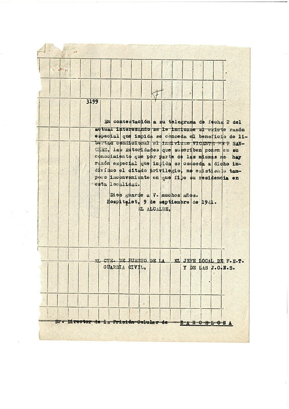 Documents informatius per a la posada en llibertat de Vicenç Fort i Sancho (a l'expedient figura com a Sánchez), que va ser alcalde de la ciutat entre el 7 de juny de 1938 i el 3 de febrer de 1939