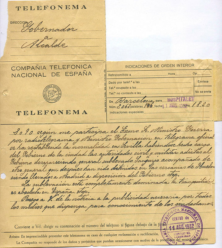 La matinada del 10 d’agost de 1932 el general Sanjurjo va intentar des de Sevilla un cop d’Estat contra el govern de la República. La rebel·lió va ser sufocada en poques hores i així es va comunicar arreu d’Espanya. A l’Hospitalet, l’alcalde Josep Muntané va ser informat, via telefonema, pel Governador Civil de Barcelona: els colpistes han estat detinguts i la tranquil·litat és absoluta. José Sanjurjo va ser jutjat i condemnant a mort, però finalment li commutaren la pena per la de cadena perpètua. Uns anys després, el 1936, Sanjurjo tornà a participar en un cop d’Estat; provocant aquest cop l’esclat de la Guerra Civil.