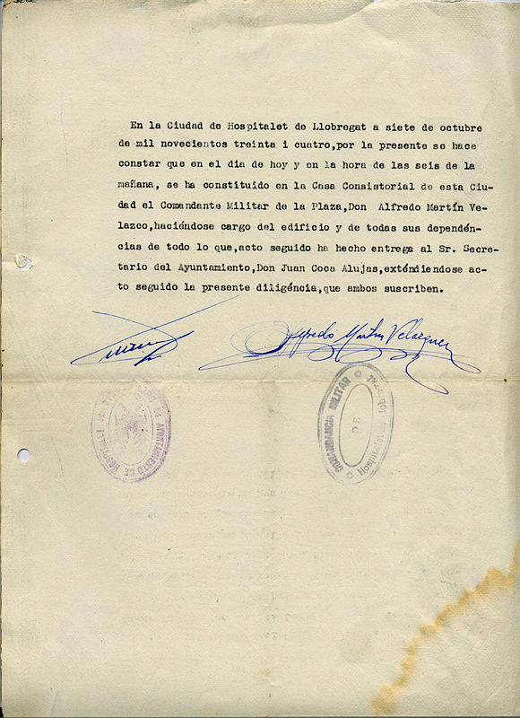 El cinc d’octubre de 1934 va tenir lloc a Astúries una revolta obrera contra la tendència conservadora del govern espanyol. A Oviedo es va proclamar la República Socialista Asturiana. Per altra banda, a Catalunya el govern d’esquerres de la Generalitat també va rebel·lar-se i el sis d’octubre Lluís Companys va proclamar l’Estat Català federat amb la República Espanyola. El mateix dia però, el president i el seu govern foren detinguts per l’exèrcit i empresonats. L’endemà, a L’Hospitalet els militars van prendre possessió de l’Ajuntament. Ramon Frontera i Bosch, l’alcalde democràticament escollit, també va ser arrestat i el comandant Alfredo Martín Velázquez passà a ocupar el seu lloc.