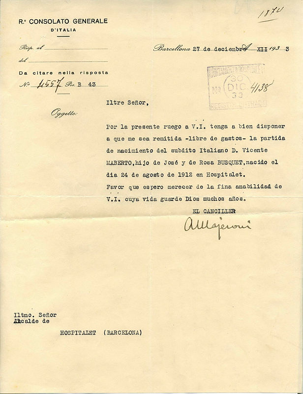Alessandro Majeroni era el vicecònsul de l’Itàlia feixista de Mussolini a Barcelona. En aquesta nota demanava que l’Ajuntament li facilités la partida de naixement Vicente Maberto, un súbdit italià que havia nascut a l’Hospitalet. Per si de cas, Majeroni explicita que li enviïn gratuïtament.
