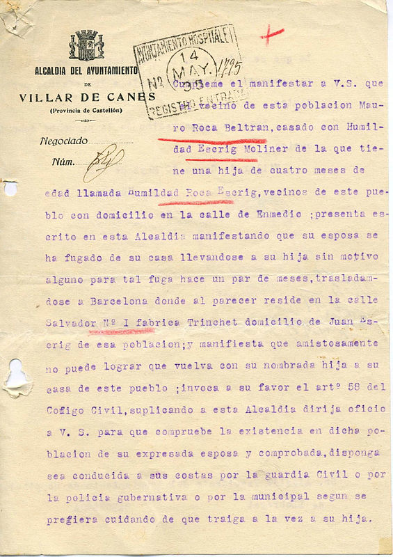 Mauro Roca Beltran, habitant d'un poble de Castelló, fa arribar a través del seu ajuntament un escrit a L'Hospitalet reclamant que es cerqui la seva dona i la seva filla i se les obligui a tornar al domicili conjugal. Però la dona, Humilitat Escrig Moliner, explica a la policia de L'Hospitalet que era maltractada pel seu marit i que no pensa tornar a Castelló. Maltractada i "no només de paraula". En aquella època aquesta violència també existia i no era perseguida. Per sort, almenys en aquest cas, sembla que la policia no es va posar de part del marit i no va obligar la dona a tornar.