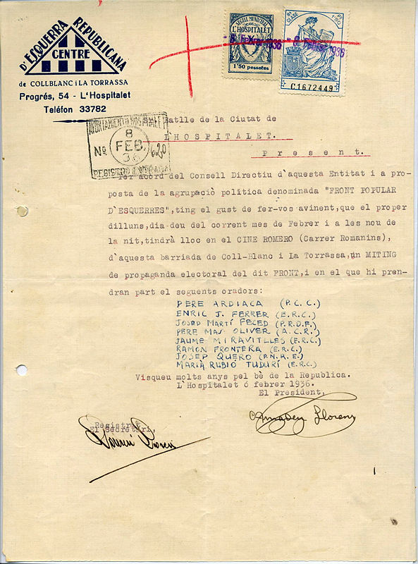 Febrer de 1936. Queda poc per unes eleccions generals espanyoles. El Front Popular, una conjunció de partits d’esquerres, espera poder recuperar el govern de la República de mans dels partits conservadors. A l’Hospitalet, el dia 10 hi ha convocat un míting al cine Romero del carrer Romanins. Hi intervindran diversos representants del Front d’Esquerres català que provenen de diferents partits: Pere Ardiaca, Enric J. Ferrer, Josep Martí Feced, Pere Mas Oliver, Jaume Miravitlles, Josep Quero, Marià Rubió Tudurí i Ramon Frontera. Aquest últim va ser alcalde de l’Hospitalet.