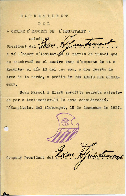 El Centre d’Esports de L’Hospitalet va convidar l’alcalde a assistir a un partit de futbol amb finalitats benèfiques el 18 de desembre de 1937. Els diners recaptats havien de ser destinats per ajudar els combatents republicans que lluitaven al front. El president del Centre d’Esports era Joan Marsol i Ricart, i el partit havia de tenir lloc al camp de La Remunta.