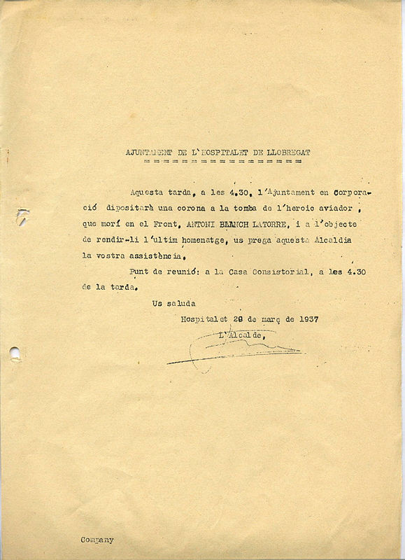 L’hospitalenc Antoni Blanch era un soldat aviador que a l’inici de la Guerra Civil es trobava destinat al Marroc. Juntament amb un mecànic, va desertar del bàndol franquista i va fugir en avió per incorporar-se a les forces republicanes. Aquesta gesta el va fer molt famós i va ser proclamat un heroi de la República. El 1937 però, Antoni Blanch va morir en un combat aeri prop de Madrid. Per aquest motiu l’Ajuntament li va retre aquest últim homenatge.