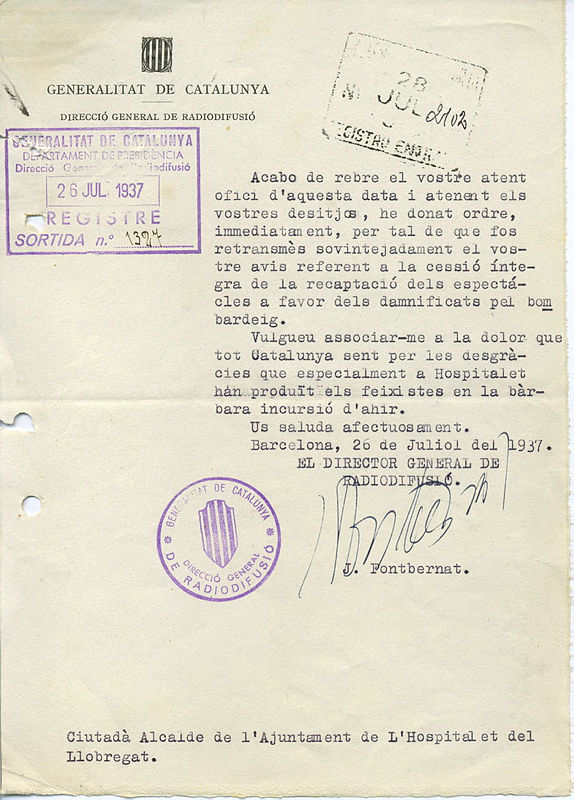 L’Ajuntament va demanar a la Direcció General de Radiodifusió de la Generalitat que s’emetés per ràdio un anunci demanant que se cedís excepcionalment la recaptació dels espectacles a favor dels afectats pel terrible bombardeig que acabava de patir l’Hospitalet i que havia provocat nombroses morts.