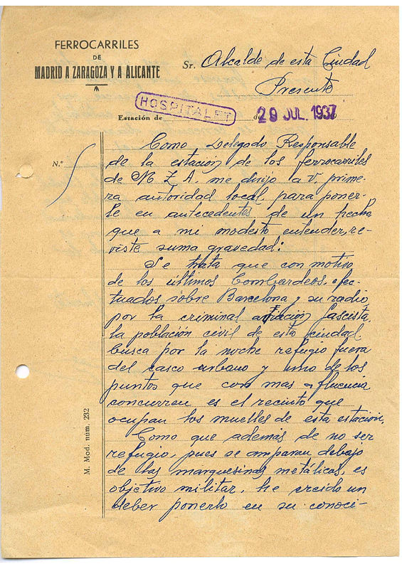 El responsable de l’estació dels ferrocarrils MZA (Madrid - Saragossa - Alacant) estava molt preocupat perquè veia que durant els bombardejos aeris molta gent corria a refugiar-se a les andanes de l’estació (entre 200 i 400 persones diàriament). Això era extremadament perillós ja que les connexions ferroviàries eren un objectiu susceptible de ser atacat per l’aviació rebel. Per aquest motiu demanava a l’alcalde que actués per fer comprendre als ciutadans que aquest no era un lloc segur.