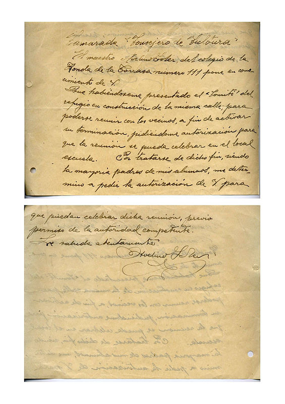 Avelino Soler, mestre de l’escola situada al número 111 de la Ronda de la Torrassa, demanava permís a l’Ajuntament per celebrar una reunió del comitè de construcció del refugi d’aquest mateix carrer. Aquest comitè estava format en gran part pels alumnes de l’escola i sembla ser que el refugi ja el tenien pràcticament acabat.