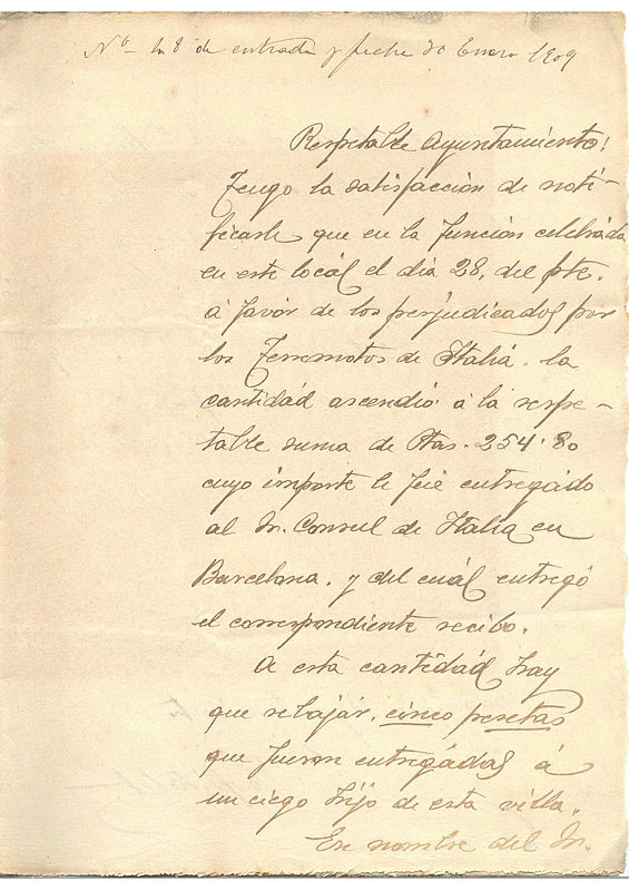 Les notícies que arribaven d’aquesta catàstrofe van originar una onada de solidaritat internacional que també va arribar a L’Hospitalet. El 28 de gener de 1909. Joan Monrós va programar una sessió especial al seu Cinematògraf Dr. Robert del carrer Major. La recaptació (254,80 pessetes) va ser entregada al Cònsol d’Itàlia. Es van descomptar cinc pessetes, que es van lliurar a Valentí, un “cec fill d’aquesta vila”.