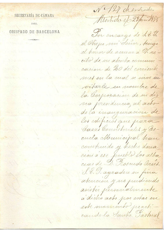 El 24 de juny de 1895 té lloc la inauguració de la nova Casa Consistorial de L’Hospitalet de Llobregat, així com de l’edifici de les Escoles públiques, gràcies al donatiu que féu Rossend Arús i Arderiu (1845-1891), veí del municipi, qui fou membre del Centre Català i secretari del Primer Congrés Catalanista. El cerimonial havia de rebre la benedicció del bisbe de Barcelona qui, no podent assistir a l’acte per estar practicant la Santa Pastoral Visita, delegà a l’arxipreste de Sant Feliu de Llobregat que verifiqués la benedicció dels edificis en nom del bisbat.