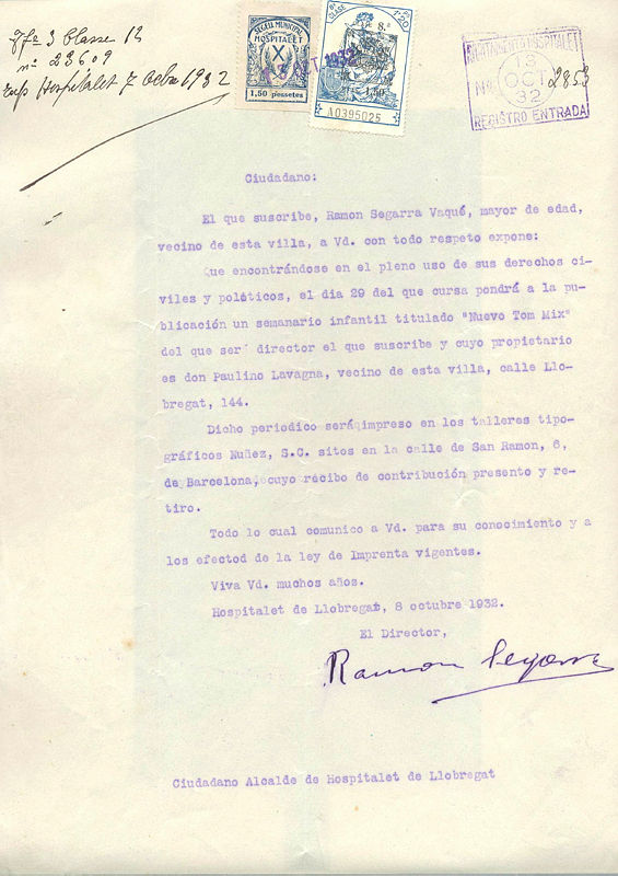 En aquesta carta d’octubre de 1932, Ramón Segarra comunica a l’alcalde de L’Hospitalet als efectes de la llei d’impremta, la propera aparició del setmanari infantil “Nuevo Tom Mix” del qual ell és el director i Paulino Lavagna, el propietari. La raó social de l’empresa era C. Llobregat, 144.