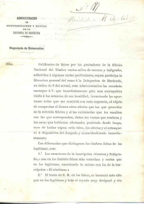En aquest cas van detectar la falsificació de segells de 15 cèntims amb la imatge del Rei. Per poder identificar-los demana a l’Ajuntament que vagi als estancs i inspeccioni els segells. Han de mirar una sèrie de característiques que fan denotar que són falsificacions: la inscripció dels 15 cèntims, la figura del Rei o el retallat de la vora que són imperfectes.