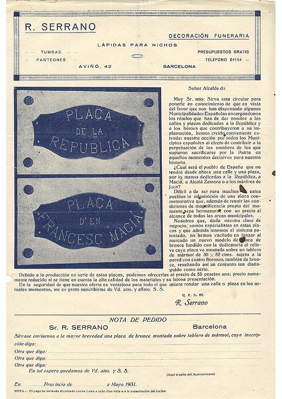 Butlletí de comanda de R. Serrano, una empresa de decoració funerària de Barcelona, on ofereixen plaques de carrer de bronze muntades sobre un tauler de marbre per commemorar la República i els seus herois.