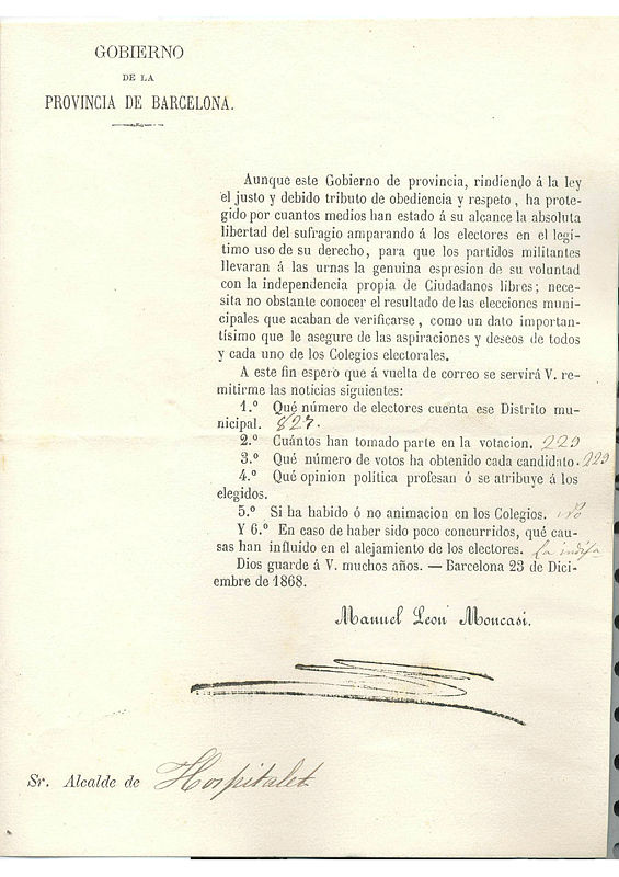 Malgrat la teòrica llibertat d’aquestes eleccions, podem constatar com a l’Hospitalet només van votar 229 individus dels 827 que tenien dret a fer-ho (un 27% de participació). A més, veiem com tots, absolutament tots els 229 electors, van votar pel mateix candidat (el que representava el sector monàrquic democràtic). En els documents s’explica que el partit oposat (el republicà segurament) es va mostrar indiferent al procés electoral i no va acudir a les urnes. La baixa participació també es podria explicar per la manca de costum de participar en processos electorals de gran part de la població.