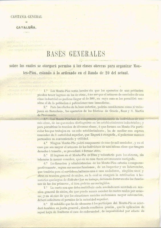 La Capitania General de Catalunya va publicar aquesta normativa que regulava la creació de mutualitats per part dels obrers. La majoria de punts intentaven limitar el poder d’aquestes associacions; com per exemple establint un número màxim de socis i prohibint que estiguessin formades per obrers de diferents indústries.