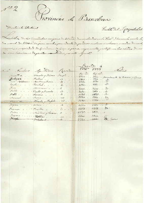 Des de 1812 es va instaurar a Espanya el sufragi censatari. Això volia dir que a les eleccions només podien votar els homes majors de 25 anys que tinguessin una renda mínima establerta per llei. A més, a les eleccions només si podien presentar els homes que complissin aquests requisits i que a més sabessin llegir i escriure. Aquest llistat correspon segurament als homes que podien presentar-se a les eleccions de 1837. Com es pot observar només 13 homes tenien dret a ser representants públics.