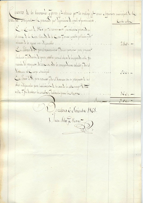 En aquest document Joan Soler i Mestres fa el recompte dels honoraris que ha de cobrar per la seva feina com a arquitecte municipal entre gener i juny de 1860 (tot i que l’escrit és de setembre de 1861). D’aquesta manera podem saber quines obres públiques es duien a terme o es projectaven a l’Hospitalet durant els primers mesos de 1860: l’anivellament de la Riera de la Creu, el projecte de portar aigua potable a la població i l’habilitació d’un edifici del carrer major com a escola i com a casa per a la mestra.